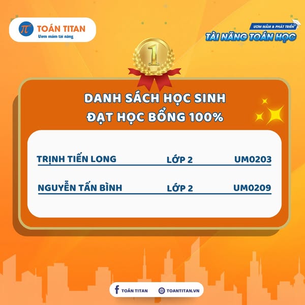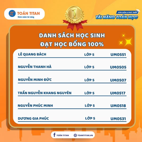 Trung tâm Toán TITAN xin công bố danh sách các thí sinh đạt học bổng 𝟏𝟎𝟎% trong kỳ thi Ươm Mầm & Phát Triển Tài Năng Toán Học 2025!