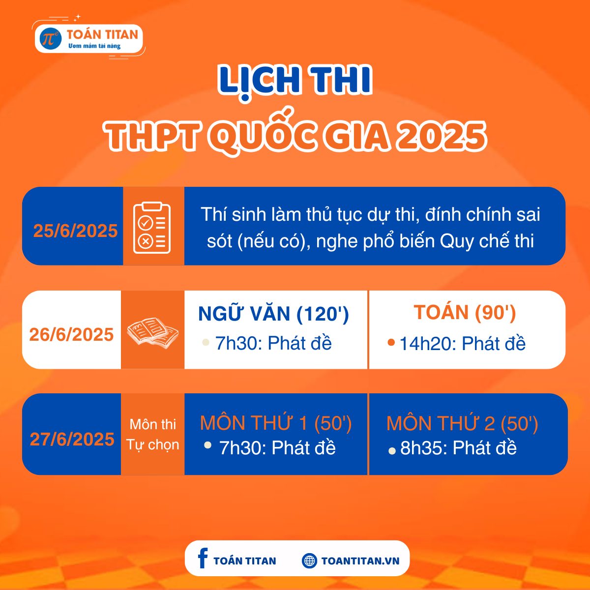 🎯 Lịch thi THPTQG 2025 chính thức đã được công bố! Đến lúc các sĩ tử lên kế hoạch ôn tập thật khoa học để đạt kết quả tốt nhất. Đừng để thời gian trôi qua lãng phí, Toán TITAN sẽ đồng hành cùng bạn để tăng tốc ôn luyện và đạt điểm cao!