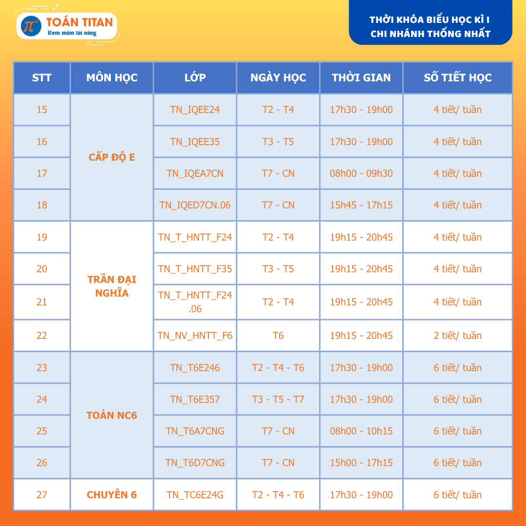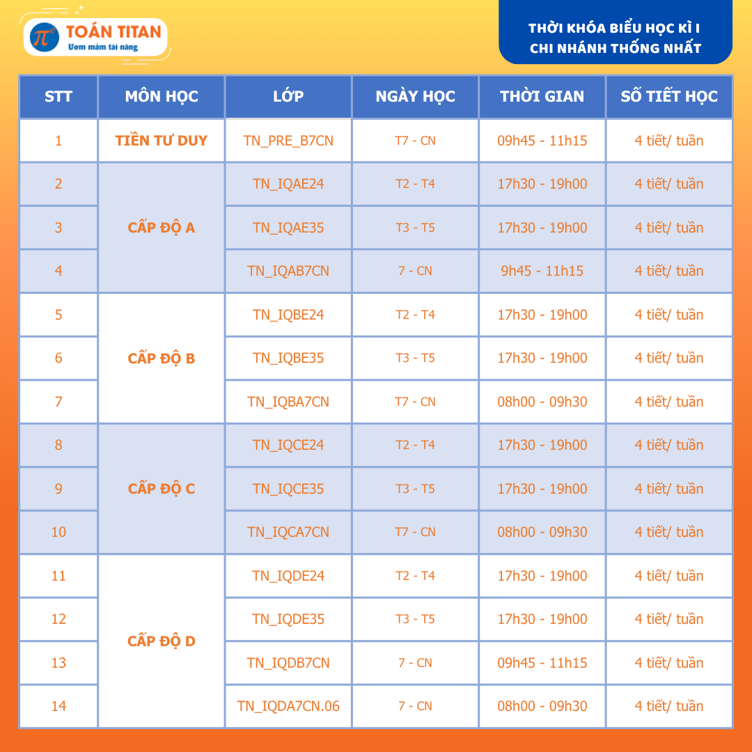 Toán TITAN – Chi nhánh Thống Nhất đã sẵn sàng với lịch học Học kỳ I được thiết kế bài bản, đa dạng theo từng khối lớp từ lớp 1 đến lớp 12.